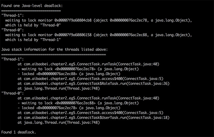 对于死锁,这种情况基本上很容易发现,因为jstack可以帮助我们检查死锁,并且在日志中打印具体的死锁线程信息。如下是一个产生死锁的一个jstack日志示例: