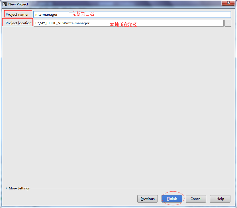 4.输入完整项目名,和项目保存在本地的路径 ->finish