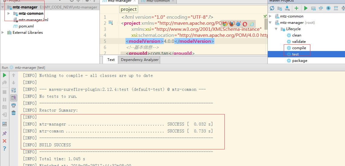 完了之后,我们打开Maven视图,点击一下父工程test看看是否存在错误,如看到以下打印,则表示子工程创建成功。