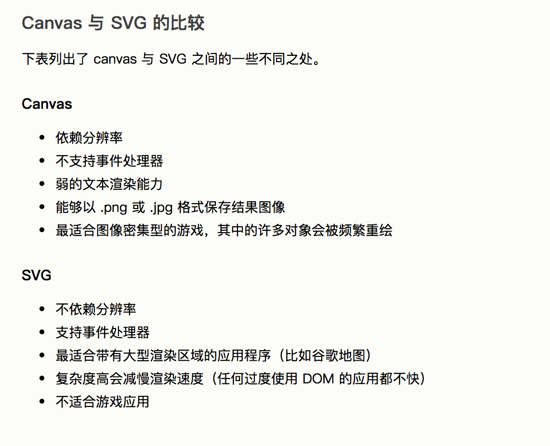SVG 是一种使用 XML 描述 2D 图形的语言。 Canvas 通过 JavaScript 来绘制 2D 图形。 Canvas 是逐像素进行渲染的。