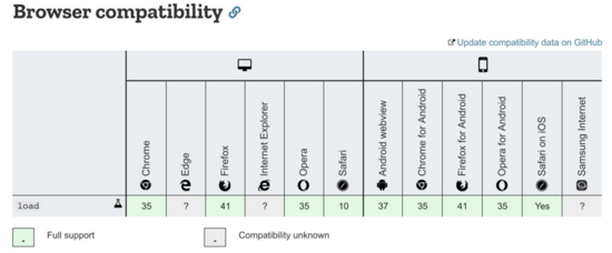 先用image的onerror事件trick css文件的加载,然后调用document.fonts.load看字体是否加载完成,这样就可以准确监听到字体加载完成,但是这个api存在兼容性问题,来看具体表格: