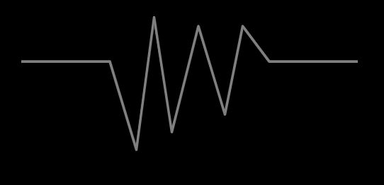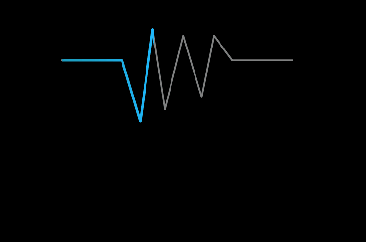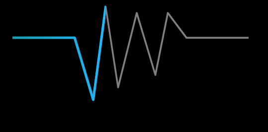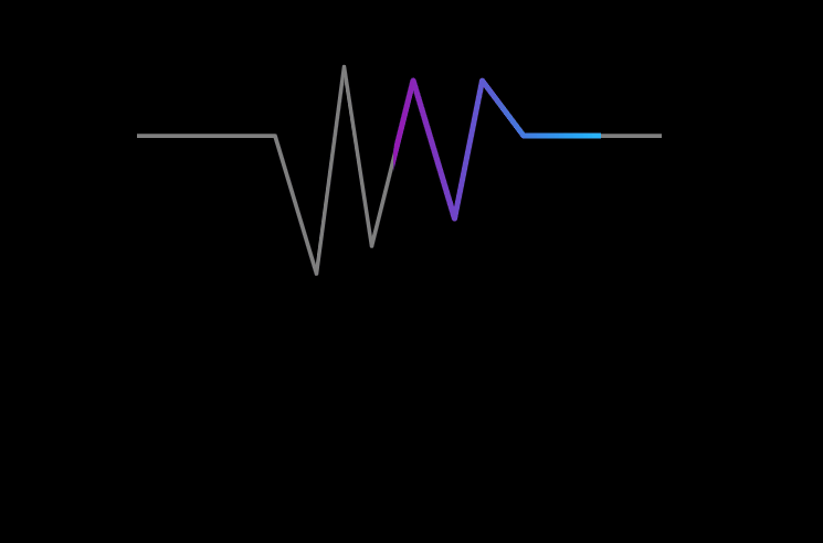 我们知道渐变没法沿着任意路径,如果计算折线,分段计算渐变又很麻烦。 其实在本案例中,虽然是折线,但是整体的运动方向总是从左往右的,所以可以用从左往右的渐变来近似模拟既可以: