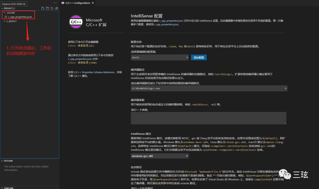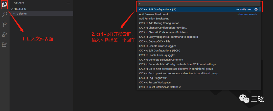 第二步,进入文件页面,创建一个新文件,然后 ctrl+p 打开文件检索,输入 >,选择弹出的内容的第一个,进入详情配置页面。同时,工作区会自动创建一个 .vscode 文件夹和一个 c_cpp_properties.json 的文件。