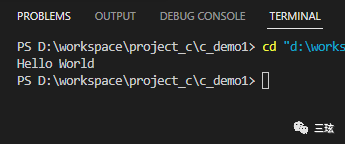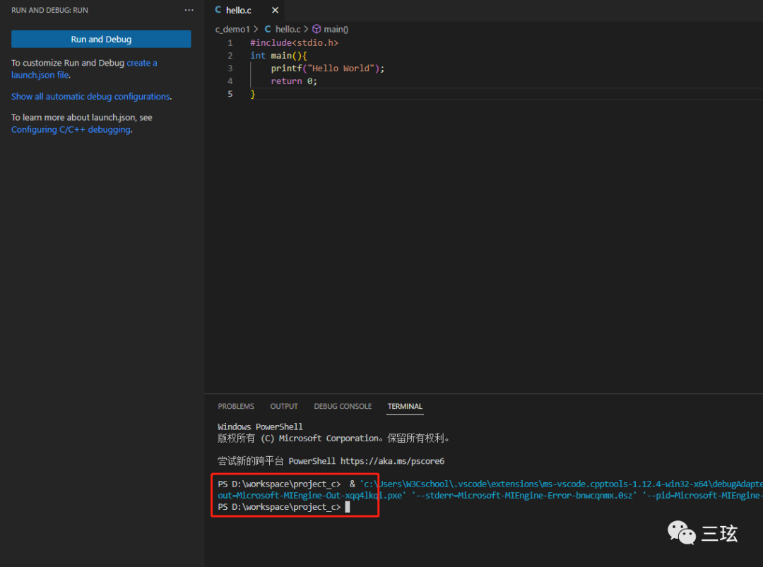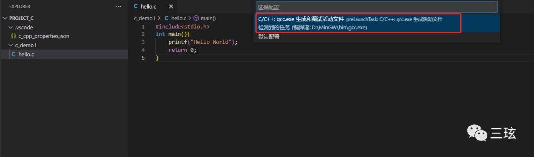 第三步,在工作刚才创建的 c_demo1 文件下新建一个 hello.c,输入神功第一招,Hello World。按下 F5,选择编译器,等待运行。