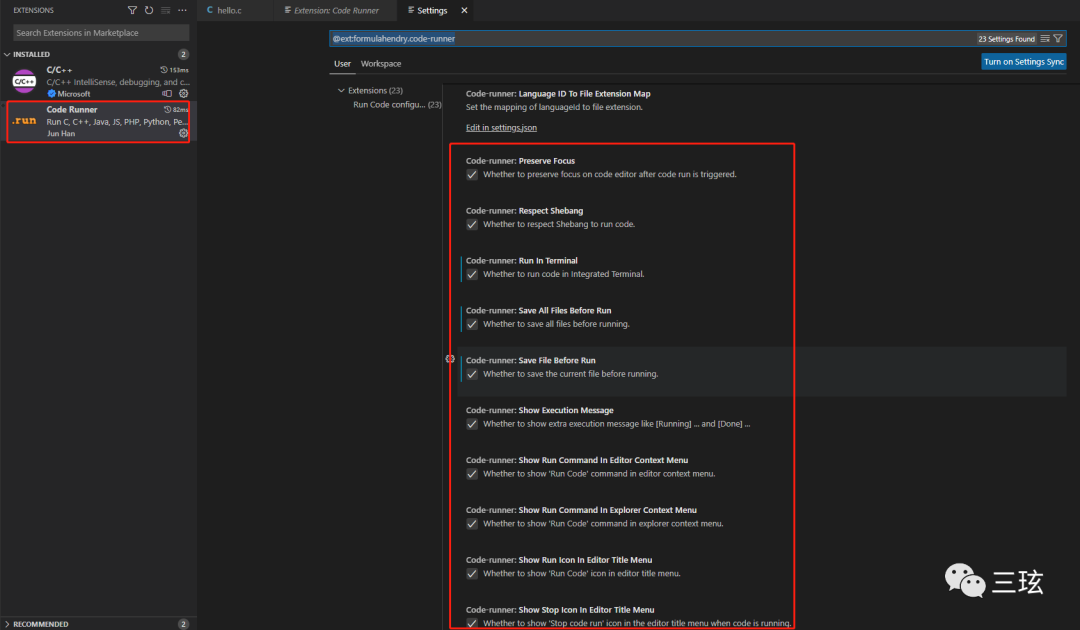 在一番鼓捣之下,找到一个最简单的方式,打开插件扩展区,安装一个 Run Code 插件,进入插件设置页面,把这些都勾上。