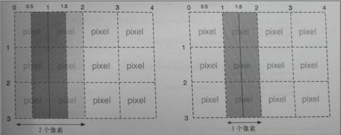 如果你在某2个像素的边界处绘制一条1像素宽的线段,那么该线段实际会占据2个像素的宽度;