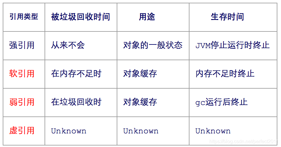 虚引用 | Phantom Reference | 又称为幽灵引用或幻影引用,最弱的一种引用关系。一个对象是否有虚引用的存在,完全不会对其生存时间构成影响,也无法通过虚引用来取得一个对象实例。 | 为一个对象设置虚引用关联的卫衣目的就是能在这个对象被收集器回收时收到一个系统通知 |