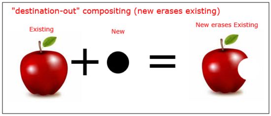 正如上图,红苹果和黑色的圆,通过 globalCompositeOperation
