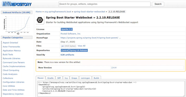 在https://mvnrepository.com/里,查找websocket的依赖。使用springboot的starter依赖,注意对应自己springboot的版本。