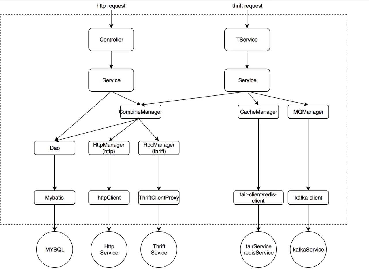 从我们的业务开发中总结了一个较为的理想模型,这里要先说明一下由于我们的 RPC 框架选用的是 Thrift 可能会比其他的一些 RPC 框架例如 Dubbo 会多出一层,作用和 controller 层类似。