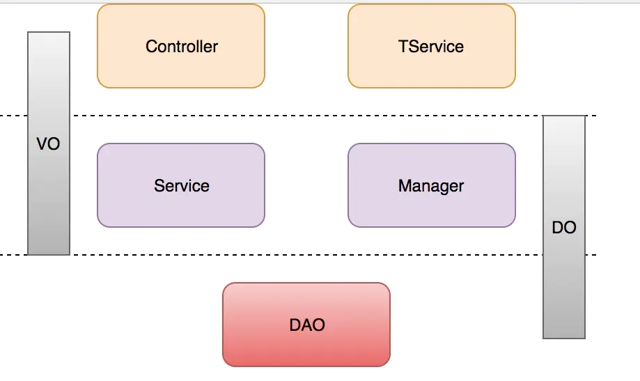 阿里巴巴规约中的分层比较清晰简单明了,但是描述得还是过于简单了,以及 Service 层和 Manager 层有很多同学还是有点分不清楚之间的关系,就导致了很多项目中根本没有 Manager 层的存在。
