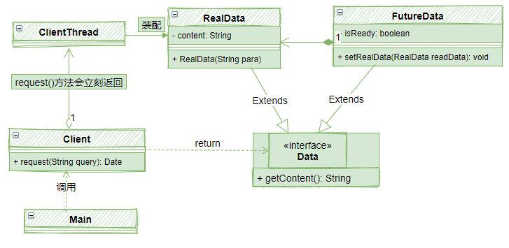- Client:返回Data对象,立即返回FutureData,并开启ClientThread线程装配RealData
