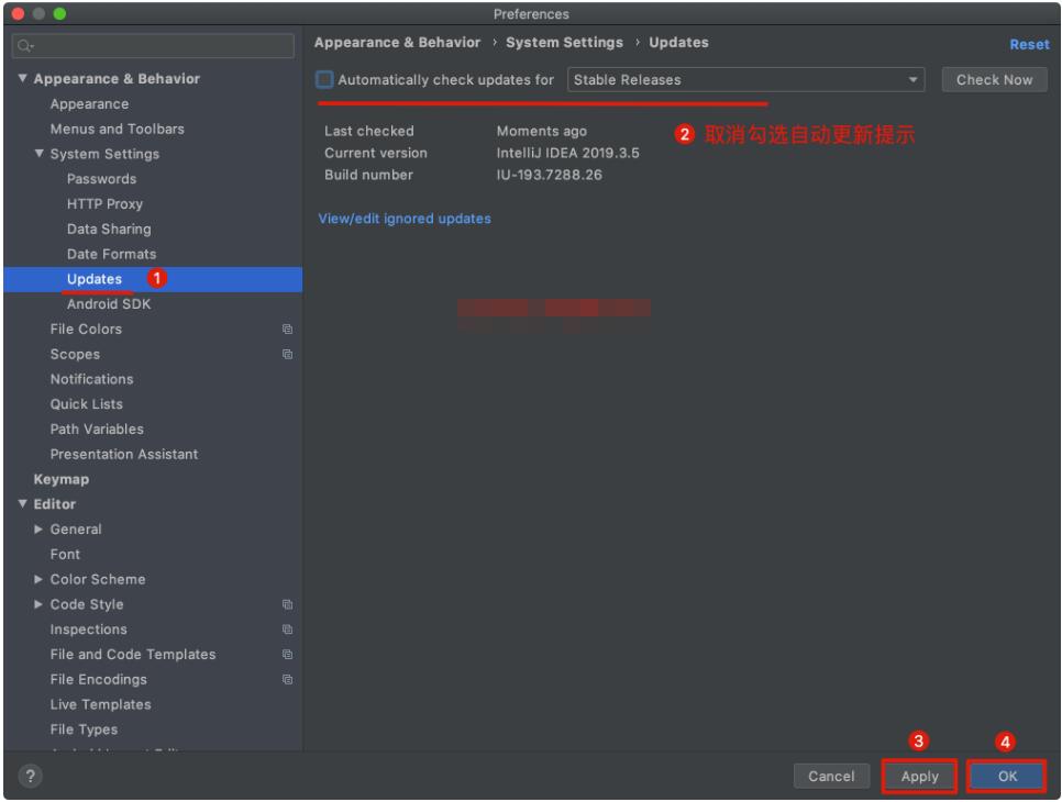 找到 Updates 菜单,取消勾选 IDEA 更新提示,点击应用就 OK 了。这样下次就再也不会弹出烦人的提示框了。