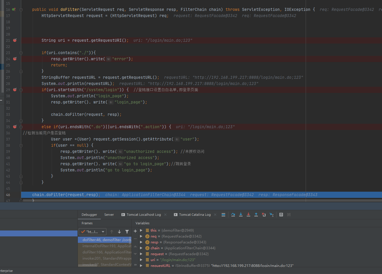 加上随便内容后,代码中就识别不到了。则会走到最下面的chain.doFilter(request,resp);