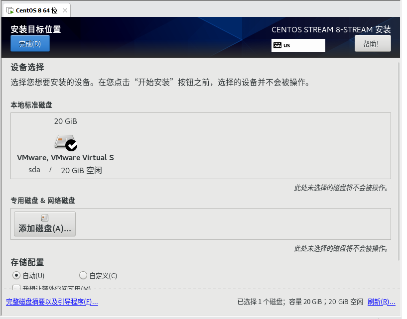 安装目标就是要将系统安装在哪块硬盘(这里是虚拟机,只有一块硬盘,在物理机中可能会有多个磁盘分区,所以要记清楚各个磁盘分区的特征和命名方式)直接选择自动等选项,可以简单的设置完磁盘(在其他系统上可能还要设置Linux的各种分区)。