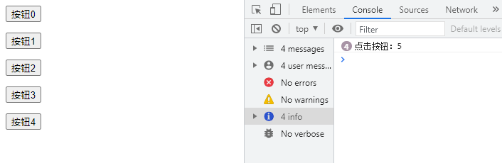 可当点击按钮时,我们发现获取到的序号一直都是5,也就是 i 最后的值。