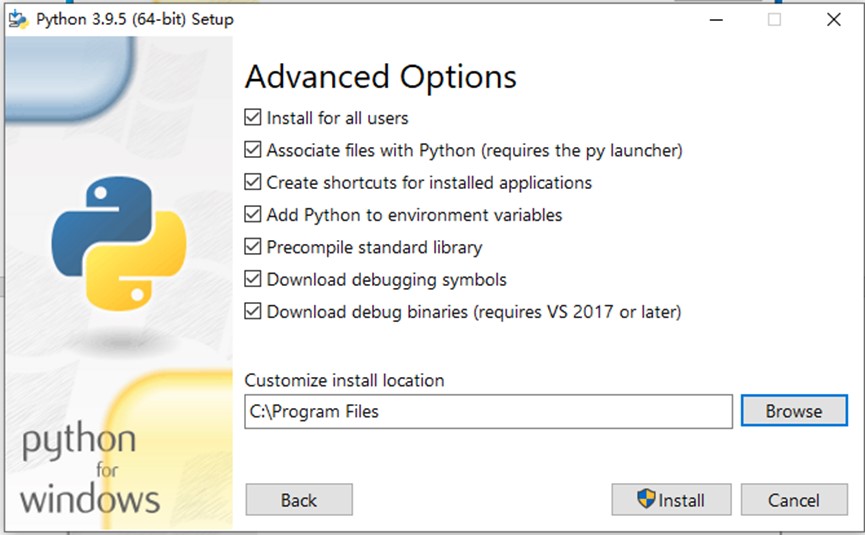 这里的选项分别为:为所有用户安装,将文件与 Python 关联(需要启动器),为 Python 创建快捷方式,将 Python 添加到环境变量,预编译标准库,下载调试符号和下载调试二进制文件(需要VS 2017 或更高版本)。读者请按需取用,最后设置好安装路径,点击Install即可安装Python。