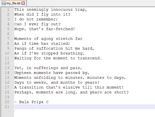 这一次,文件my_file.txt存在,else块被触发并打印出其内容,如下所示: