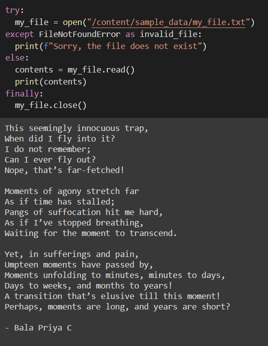 - 如果try块成功,并且文件确实存在,则读取并打印出文件的内容。