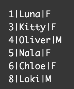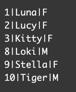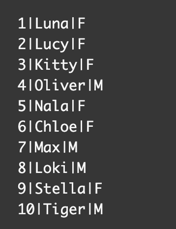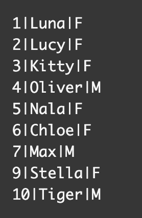在此示例中,我们有一个名为cats的表,其中当前有 10 行。列则是id,name和gender。