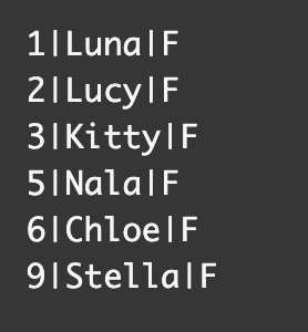 在这个例子中,我想从cats这里的原始表中删除 Lucy、Stella、Max 和 Tiger 的名字: