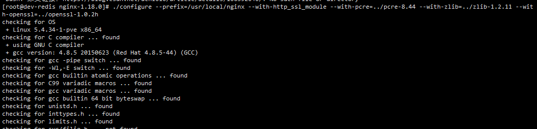 ./configure --prefix=/usr/local/nginx --with-http_ssl_module --with-pcre=../pcre-8.44 --with-zlib=../zlib-1.2.11 --with-openssl=../openssl-1.0.2h