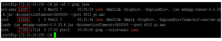 上面的命令将显示在这台机器上运行的所有 Java 进程及其参数、进程 ID 和启动它的用户。当我发出上述命令时,以下是我的 AWS EC2 Linux 实例中的输出: