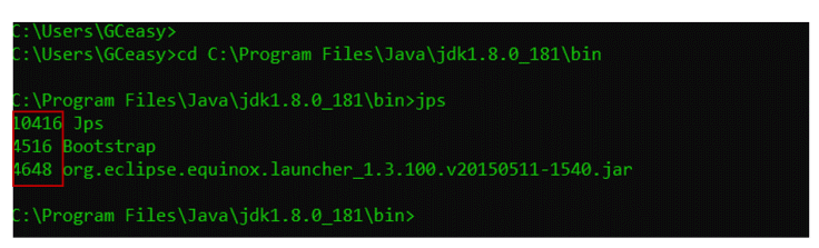 注意:与 Linux 中的“ps”命令(上面给出的示例)不同,您不会看到所有 Java 进程参数。这种方法的一个缺点是 'jps' 将只显示 java 进程的第一个命令。只有在发出 'ps' 命令时,您才能看到所有的 java 进程参数。
