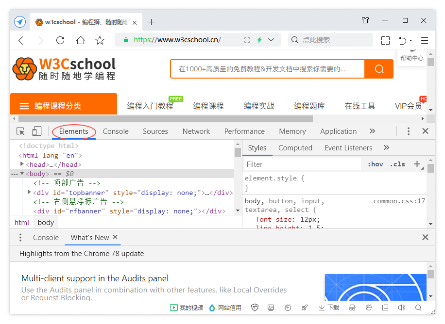 )。 - 单击屏幕底部出现的新部分左上角的“元素(Elements)”选项卡。