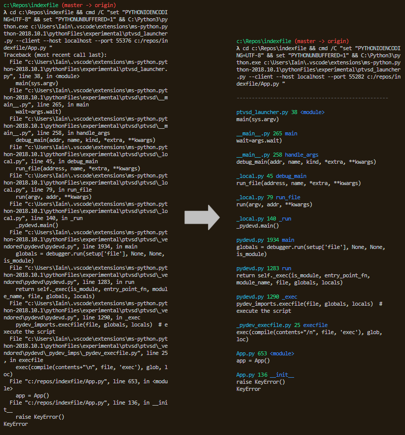 PrettyErrors只做一件事并且做得很好。在支持彩色输出的终端中,它将隐秘的堆栈轨迹转换成更适合用微弱的人眼解析的东西。无需再扫描整个屏幕来查找异常的原因……您现在就可以一目了然!