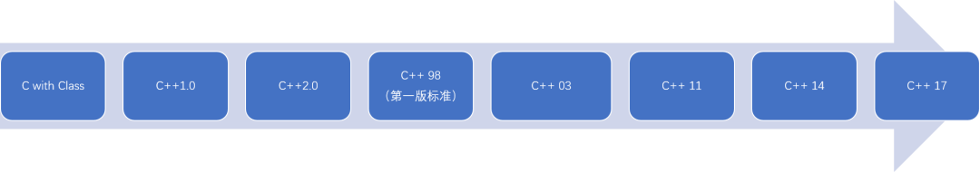 」。很明显它是在 C 语言的基础上扩充了类class等面向对象的特性和机制。但是后来经过一步步修订和很多次演变(如下图所示),最终才形成了现如今这个支持一系列重大特性的庞大编程语言。