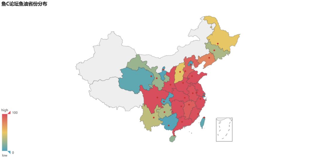 OK,接下来我们来看看论坛鱼油们的省份分布吧,这里只统计了国内的鱼油: