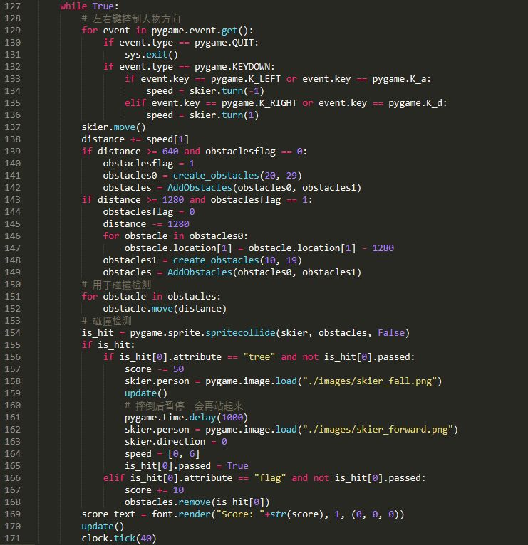 由于游戏涉及到碰撞检测(滑雪者与树和小旗之间的碰撞),因此我们定义两个精灵类,分别用于代表滑雪者和障碍物(即树和小旗):