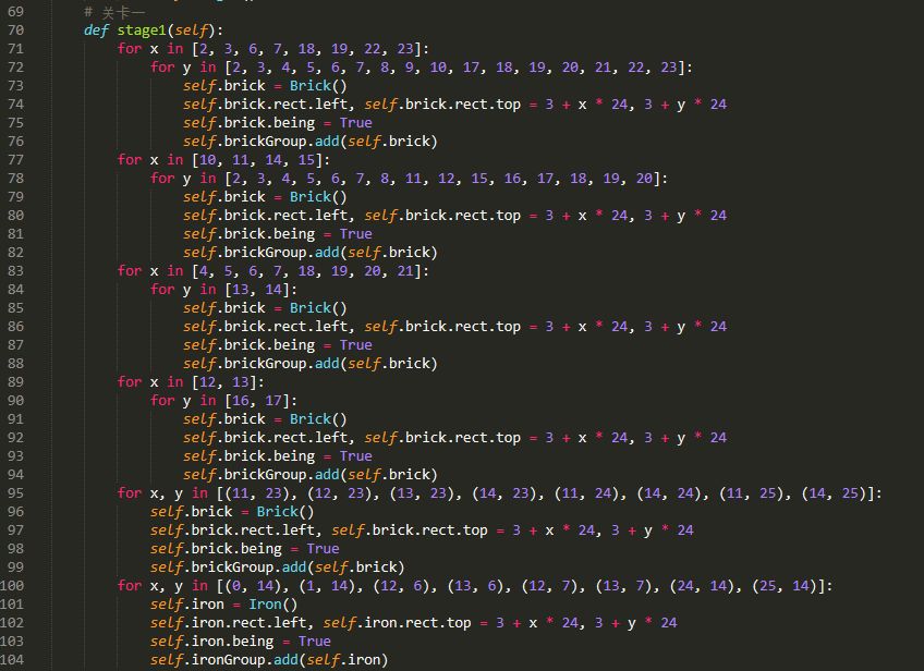 Emmmm,游戏的大背景是黑色的,然后在上面堆上一些步骤一中定义的障碍物就可以完成地图设计了。其中,钢墙不能被一般的子弹击破,砖墙可被任意子弹击破,除墙外,坦克可以穿过任意障碍物,不过没有任何附加效果(有兴趣的小伙伴可以自己扩展一下~比如冰上的坦克速度加快等等):
