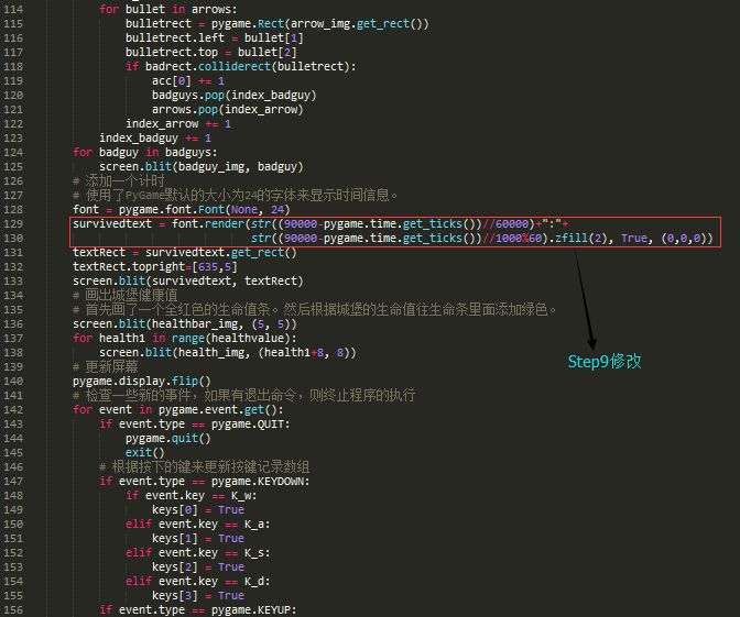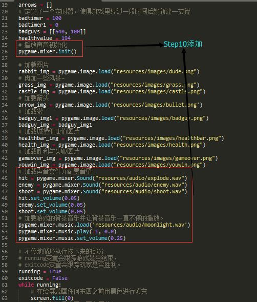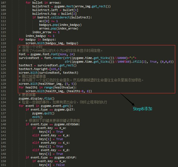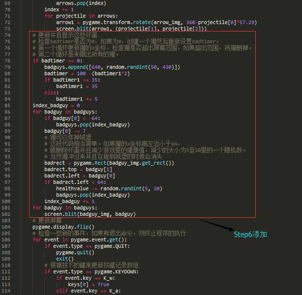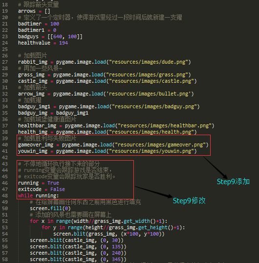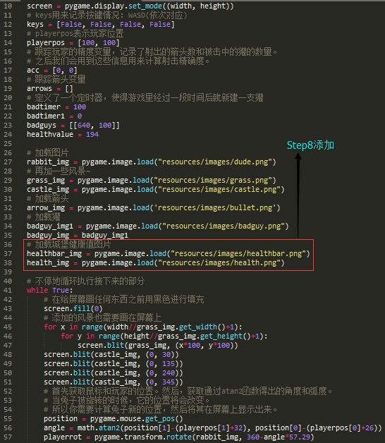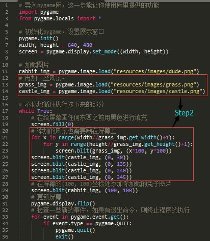 首先载入所需的图片;其次依次通过x和y进行循环,并且根据循环里x和y的值来画上草的效果;接下来的几行就是在屏幕上画出城堡。