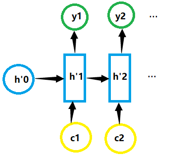 得到c之后,我们需要另外一个RNN网络对其进行解码操作,即Decoder。你可以把这个c当作初始状态h'0输入到Decoder中: