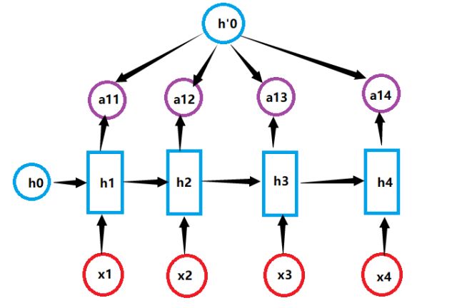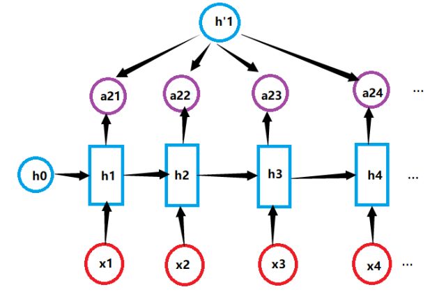 那么这些权重aij该如何确定呢?aij自然也是从模型中学得的,我们一般认为它与Encoder的第j个阶段的隐状态和Decoder的第i-1阶段的隐状态有关。