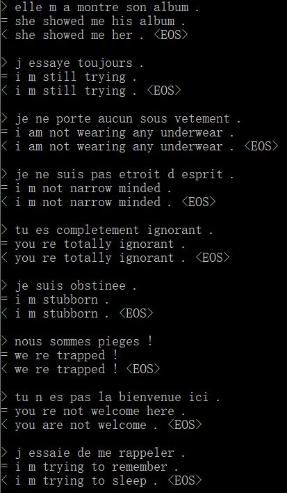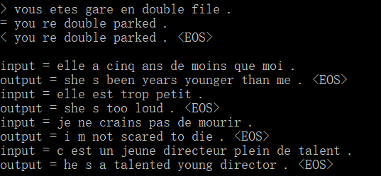 当然,有些翻译结果就不怎么理想了。因为模型和训练数据过于简单了(T_T这里就不举例了)~~~