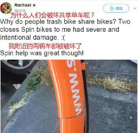在推特上,就有美国人晒被损坏的共享单车,质疑“为什么总有人破坏”?