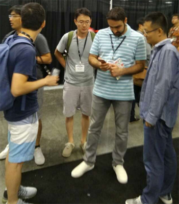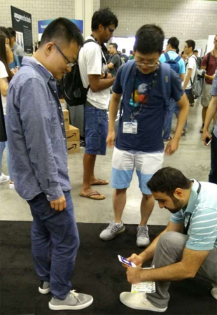 在阿里巴巴展台,中国的工程师作拍立淘的技术分享,吸引了众多同行工程师。其中,一位Google工程师认真看完技术分享以后,表示要亲自体验。