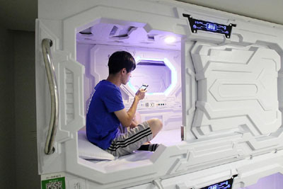 共享床铺和日本胶囊宾馆之类基本差不多。共享床铺”是一个长约2米、宽约1米的白色太空舱,舱内可调节灯光,还配备USB接口、充电口、免费Wi-Fi、插座等,有小型换气扇。