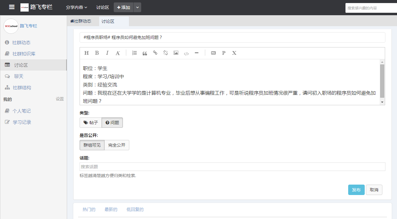 在W3Cschool官方群时常会有一些学生与小白程序员询问探讨技术这个行业的就业前景,学习方向,薪资报酬等问题。为此有着10年职场与创业经验的W3Cschool校长路飞,专门在W3Cschool开设了【校长路飞专栏】社群针对初入职场程序员的常见问题进行一次系统的梳理解答。希望可以帮助在迷雾森林里程序猿看清楚前进的方向。