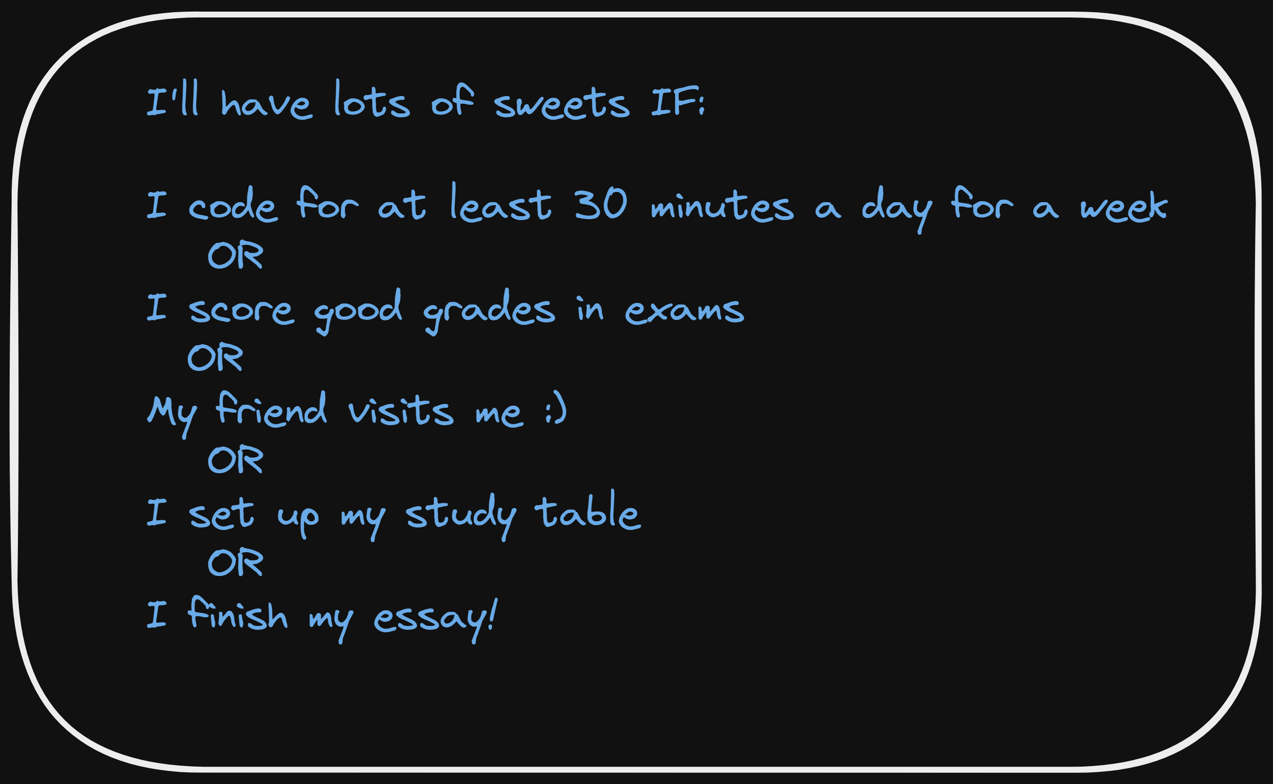 假设您决定提高工作效率并写下下面显示的列表。然而,你选择不苛求自己,并决定只要清单中的一项发生,你就可以拥有很多糖果![