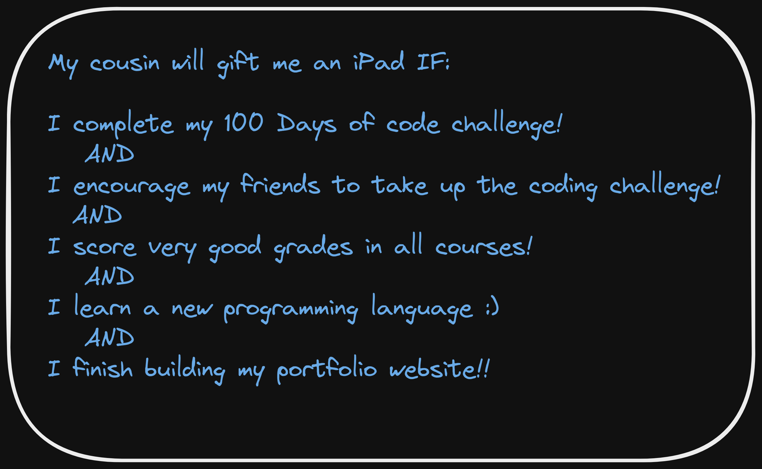 让我们考虑以下示例。这一次,您要争夺 iPad,而且条件更加严格。您必须完成列表中的所有任务才能从您的堂兄那里获得 iPad。
