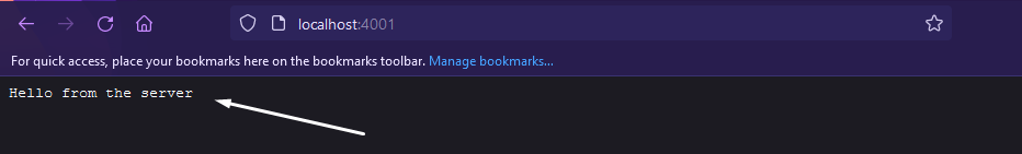 使用上面的示例代码,我们的服务器将侦听端口 4001,然后在我们访问该端口时向我们发送“Hello from the server”响应。