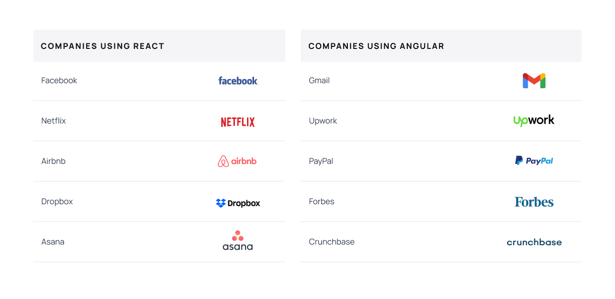 经验丰富的前端开发人员分享说,当 React.js 是早期初创公司和小公司的更好选择时,Angular 非常适合企业解决方案和企业部门。这可以解释为,大企业不会经常改变他们的优先事项,而且他们的 CTO 更早知道战略目标。