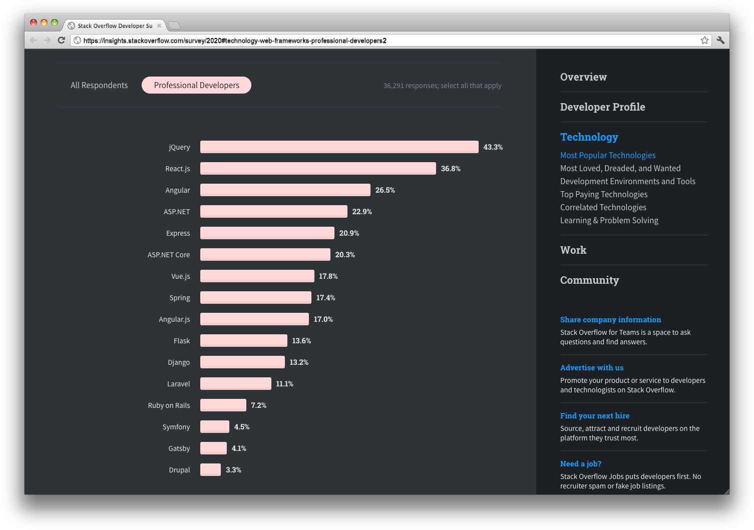 去年对 Stackoverflow 用户的调查表明 React.js 比 Angular 受欢迎 10%。