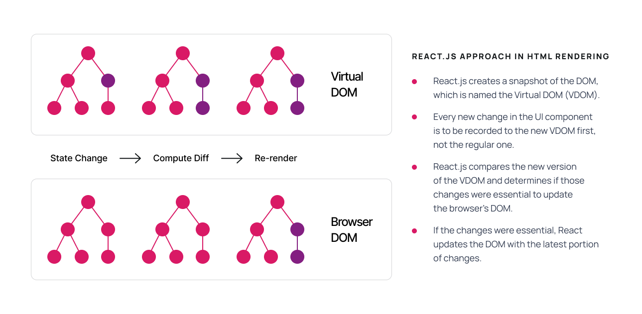 当前的情况是:如果用户浏览器在单击页面时发生了任何更改,这些更改将自动记录到 DOM 中。要在网页上显示更改,浏览器应重新加载整个 DOM 结构。它会给浏览器带来更多的负载并降低应用程序的性能。