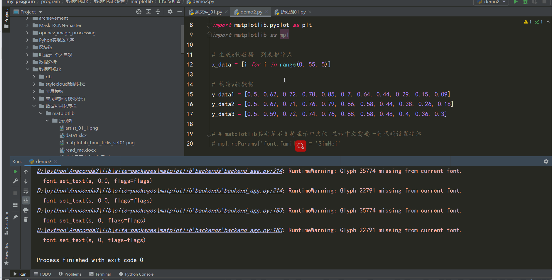 可 matplotlib 并不支持中文显示。有中文显示会出现如下问题:
