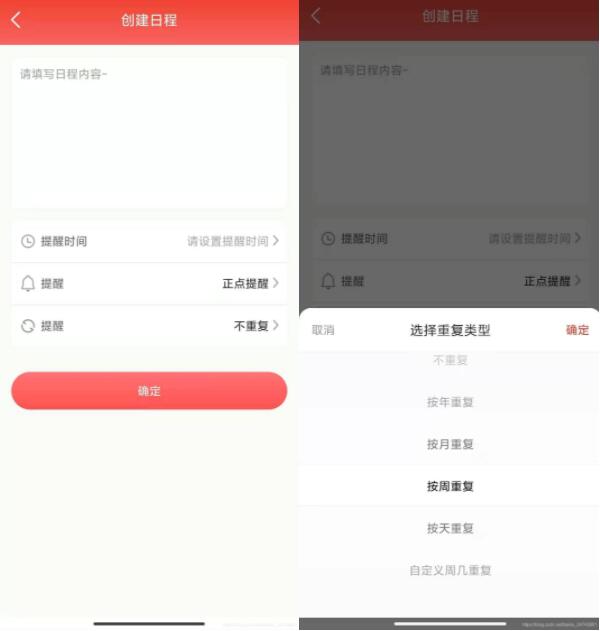 String tipTime = "2021-04-25 12:00"; long start = TimeUtils.stringToLong(tipTime ,"yyyy-MM-dd HH:mm"); long end = start + 60 * 60 * 1000L; LogUtil.d("start:" + start); LogUtil.d("end:" + end); String[] split = tipTime.split(" "); String[] dateStr = split[0].split("-"); int month = Integer.parseInt(dateStr[1]); int day = Integer.parseInt(dateStr[2]); String until = "20221231T235959Z";//截止时间:2022年12月31日23点59分59秒 String mRule = ""; switch (mRepeatType) { case 1://不重复 mRule = null; break; case 2://按年重复(每年的某月某日) mRule = "FREQ=YEARLY;UNTIL=" + until + ";WKST=SU;BYMONTH=" + month + ";BYMONTHDAY=" + day; break; case 3://按月重复(每月的某天) mRule = "FREQ=MONTHLY;UNTIL=" + until + ";WKST=SU;BYMONTHDAY=" + day; break; case 4://按周重复 String date = split[0]; String week = TimeUtils.getWeek(date); switch (week) { case "周日": mRule = "FREQ=WEEKLY;UNTIL=" + until + ";WKST=SU;BYDAY=SU"; break; case "周一": mRule = "FREQ=WEEKLY;UNTIL=" + until + ";WKST=SU;BYDAY=MO"; break; case "周二": mRule = "FREQ=WEEKLY;UNTIL=" + until + ";WKST=SU;BYDAY=TU"; break; case "周三": mRule = "FREQ=WEEKLY;UNTIL=" + until + ";WKST=SU;BYDAY=WE"; break; case "周四": mRule = "FREQ=WEEKLY;UNTIL=" + until + ";WKST=SU;BYDAY=TH"; break; case "周五": mRule = "FREQ=WEEKLY;UNTIL=" + until + ";WKST=SU;BYDAY=FR"; break; case "周六": mRule = "FREQ=WEEKLY;UNTIL=" + until + ";WKST=SU;BYDAY=SA"; break; } break; case 5://按天(每天) mRule = "FREQ=DAILY;UNTIL=" + until; break; case 6://自定义周几重复,可多选 mRule = "FREQ=WEEKLY;UNTIL=" + until + ";WKST=SU;BYDAY="; String[] weeks = mSelectedWeekStr.split(","); for (int i = 0; i < weeks.length; i++) { if (weeks[i].equals("周日")) { mRule += "SU,"; } else if (weeks[i].equals("周一")) { mRule += "MO,"; } else if (weeks[i].equals("周二")) { mRule += "TU,"; } else if (weeks[i].equals("周三")) { mRule += "WE,"; } else if (weeks[i].equals("周四")) { mRule += "TH,"; } else if (weeks[i].equals("周五")) { mRule += "FR,"; } else if (weeks[i].equals("周六")) { mRule += "SA,"; } } if (mRule.endsWith(",")) { mRule.substring(0, mRule.length() - 1); } break; } LogUtil.d("mRule:" + mRule); CalendarEvent calendarEvent = new CalendarEvent( mContent, mContent, "", start, end, 0, mRule ); // 添加事件 int addResult = CalendarProviderManager.addCalendarEvent(AddScheduleActivity.this, calendarEvent); if (addResult == 0) { ToastUtil.showShortToast("插入成功"); } else if (addResult == -1) { ToastUtil.showShortToast("插入失败"); } else if (addResult == -2) { ToastUtil.showShortToast("没有权限"); }